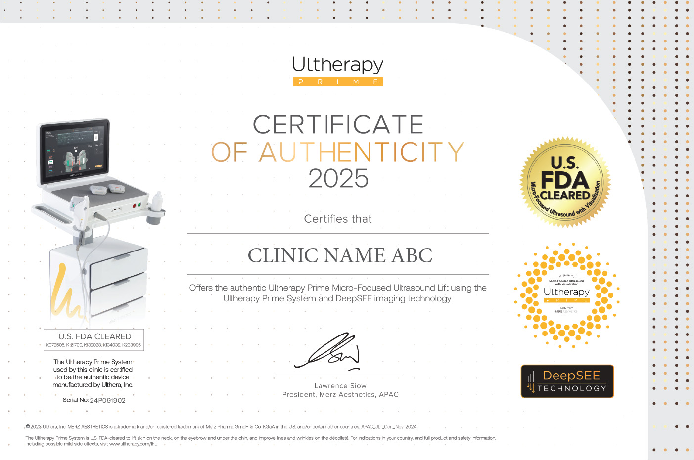 Ultherapy PRIME® is the only non-invasive treatment that has real-time imaging which allows clinicians to see precisely what layer of tissue they are treating1-3. This enables clinicians to control exactly where energy will be delivered, and to avoid structures such as bone and blood vessels2-3. It also allows precise and consistent treatment delivery to targeted tissue layers to ensure safe and efficacious treatments.